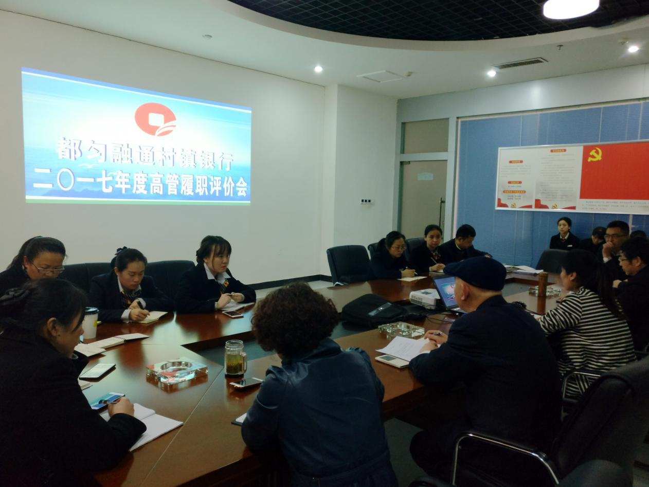 2018年2月28日中午,都匀融通村镇银行2017年度高管人员履职评价工作会在总行会议室召开。经营管理层、各部门、支行主要负责人共20余人参加了本次会议。会议由乔蓉董事长主持,并就高管人员履职评价工作流程、内容做了一个总体介绍,并强调了工作纪律。随后,行长、副行长共4名高管依次上台进行了述职,内容主要围绕履职要求、履职行为、履职结果,认真总结回顾了过去一年的工作实绩及存在问题,并提出了今后努力方向。述职完毕后,由在场参会人员对高管人员履职情况以无记名投票形式进行了民主测评。